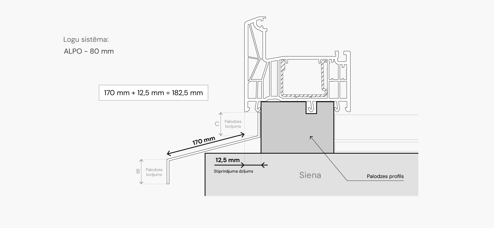 - 12,5 mm – palodzes piestiprināšanas attālums pie (ALPO sistēmas) palodzes profila;