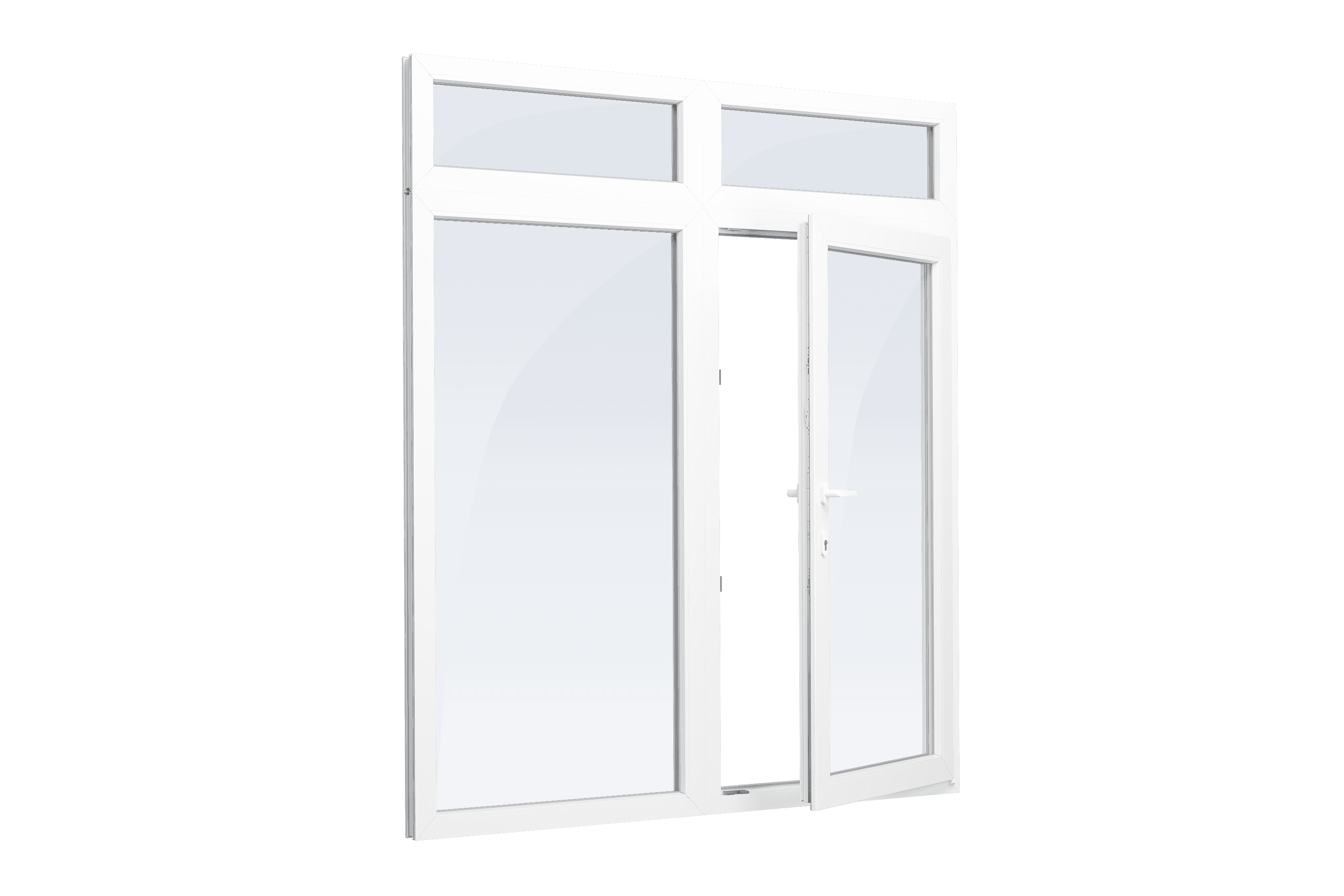 Terases durvis savienotas ar vitrīnu un diviem horizontāliem virsgaismas logiem. Ar stikla pildījumiem, vērtne – labajā pusē