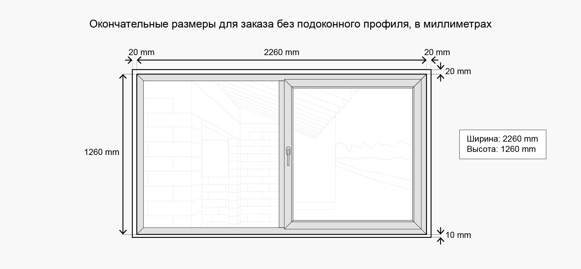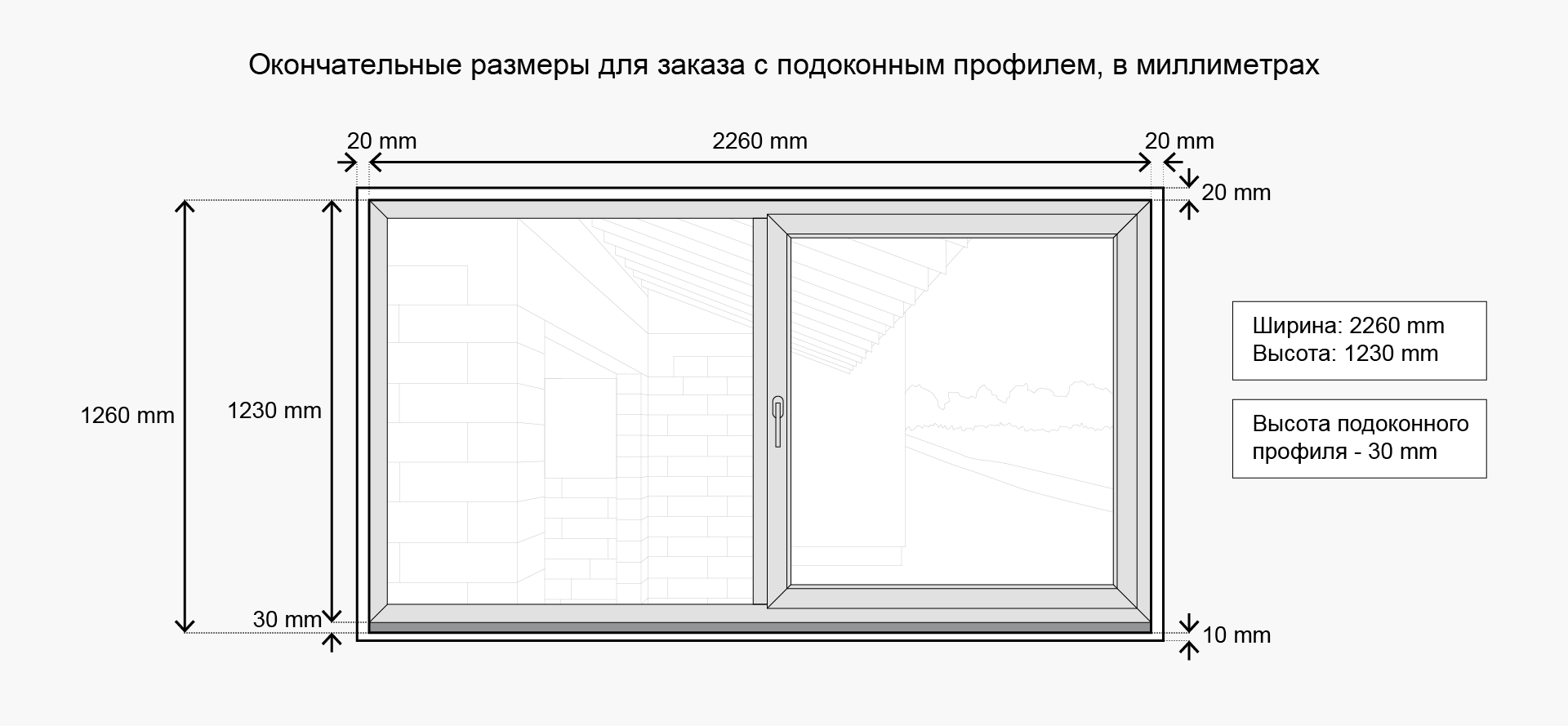 - При заказе окна с подоконным профилем: по замерам образца ширина заказываемого изделия: 2260 мм, высота: 1230 мм (1260 мм – 30 мм)