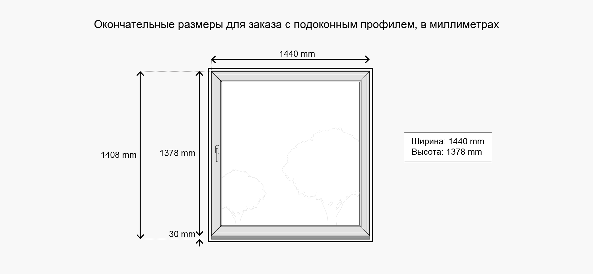- При заказе окна с подоконным профилем: по замерам образца ширина заказываемого изделия: 1440 мм, высота: 1378 мм (1408 мм – 30 мм)