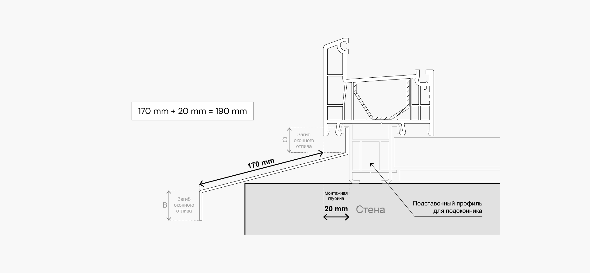 - Измерьте глубину имеющегося оконного отлива от оконной рамы до загиба оконного отлива (B). Для примера возьмем глубину имеющегося оконного отлива - 170 мм, к этому размеру добавьте 20 мм для крепления оконного отлива к подставочному профилю для подоконника. Глубина заказываемого оконного отлива: 170 мм + 20 мм = 190 мм;