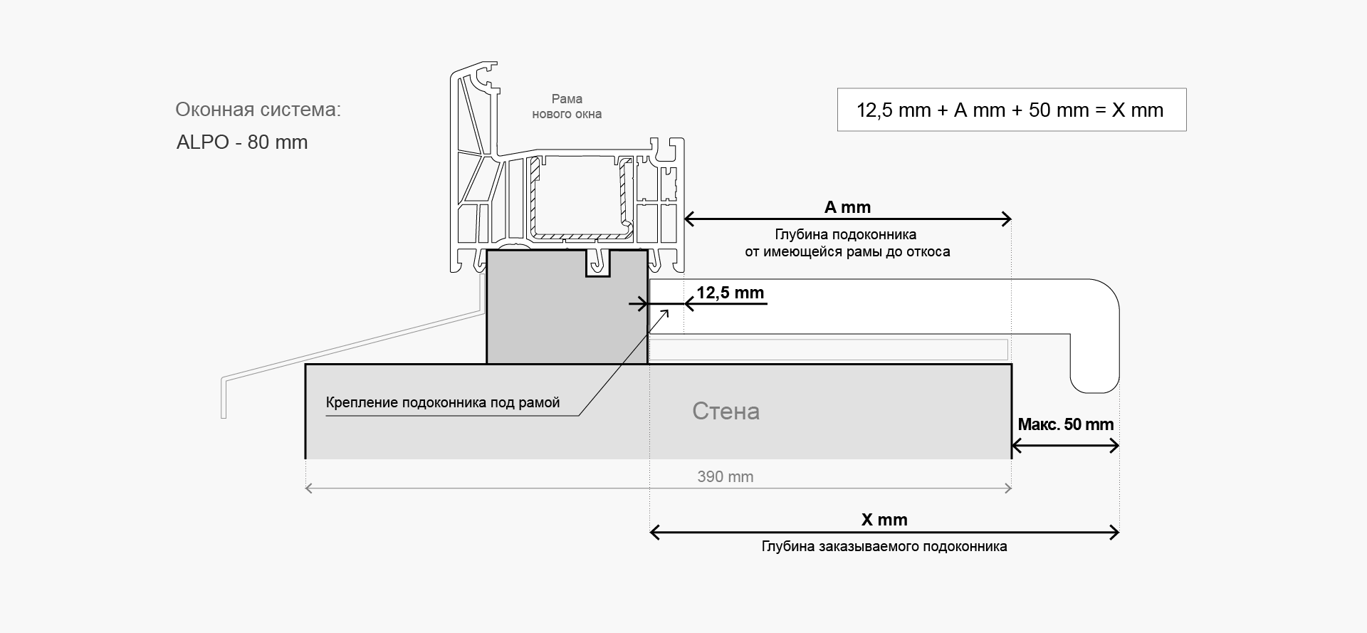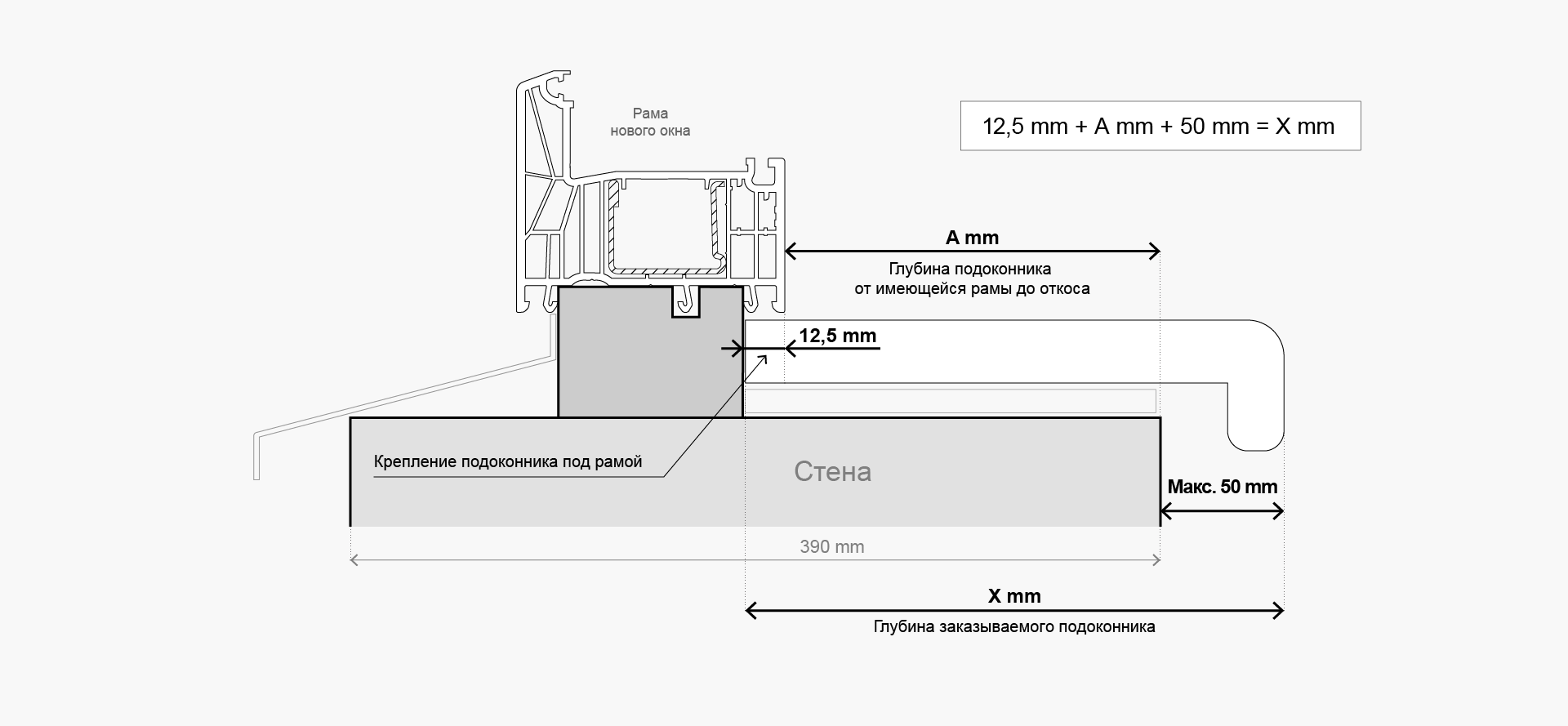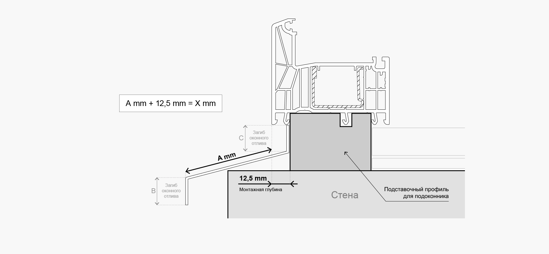 Сложите следующие параметры (см. рисунок ниже): А мм (требуемая ширина оконного отлива) + 12,5 мм (для крепления оконного отлива под рамой) = X мм (глубина оконного отлива для заказа):