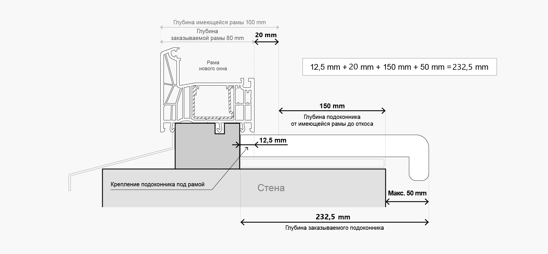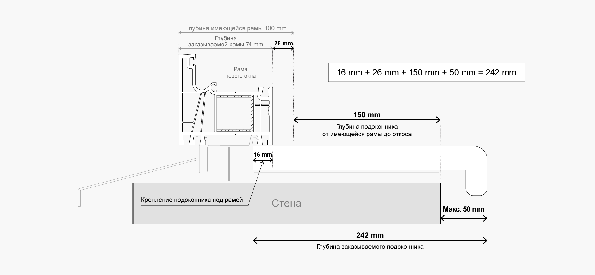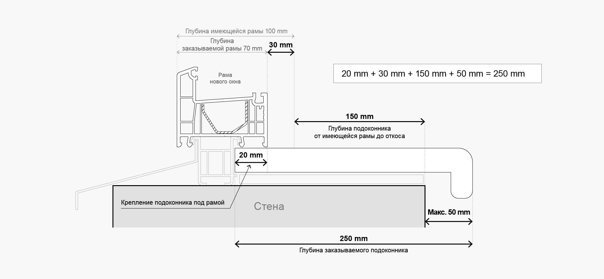Глубина заказываемого подоконника включает в себя: для крепления подоконника под рамой + разница между глубиной имеющейся рамы и глубиной заказываемой рамы + расстояние от имеющейся рамы до откоса + максимум 50 мм (для выступа подоконника за края откоса) = глубина подоконника.
