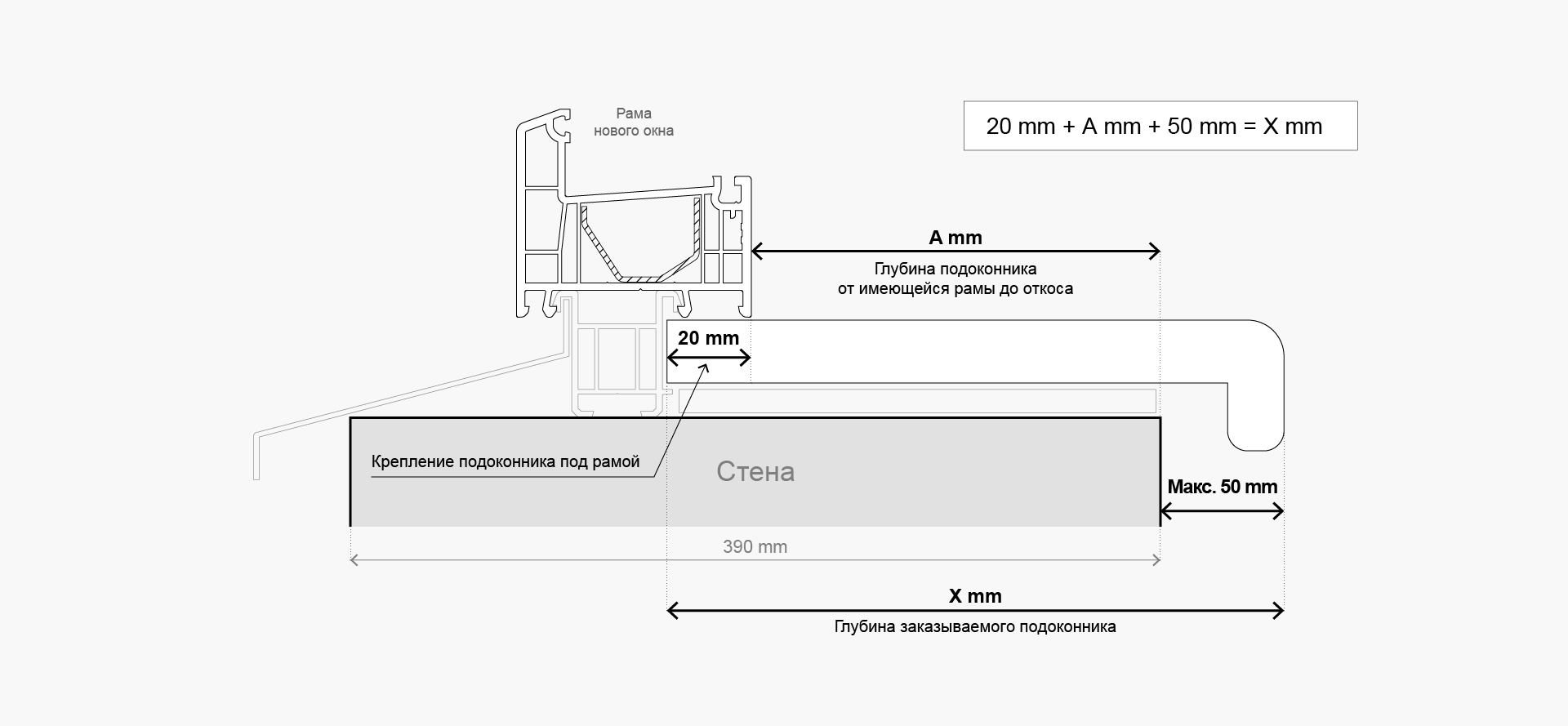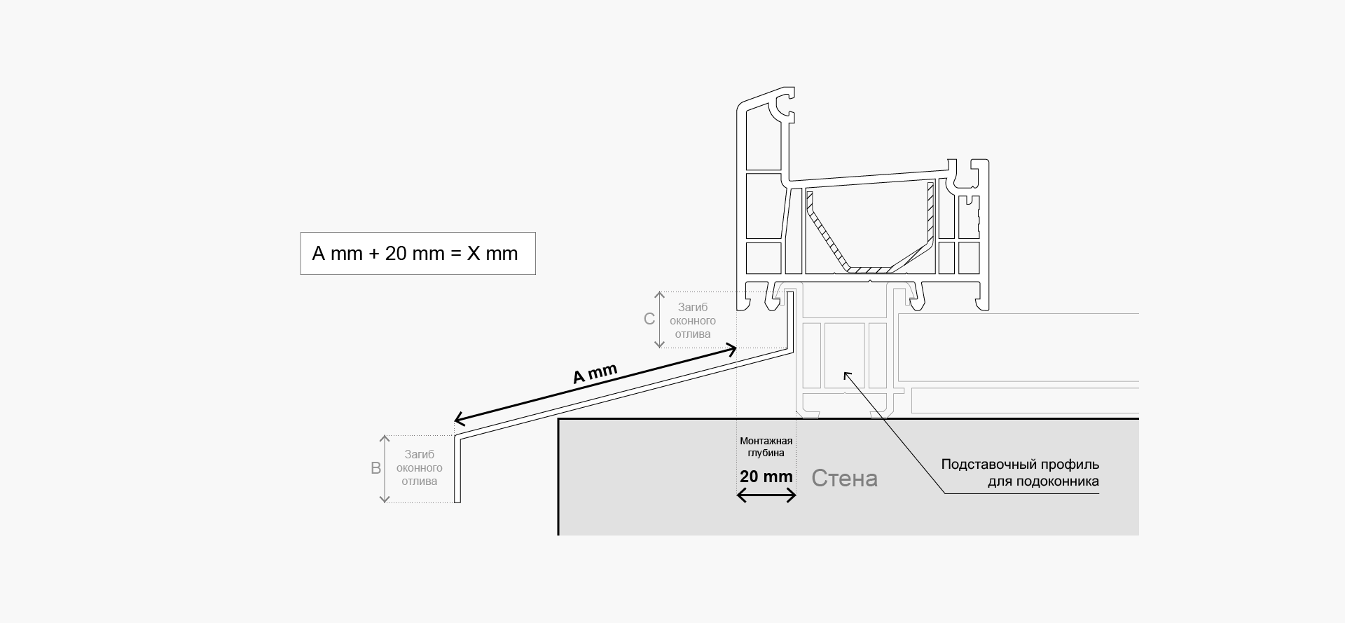 Сложите следующие параметры (см. рисунок ниже): А мм (требуемая ширина оконного отлива) + 20 мм (для крепления оконного отлива под рамой) = X мм (глубина оконного отлива для заказа):