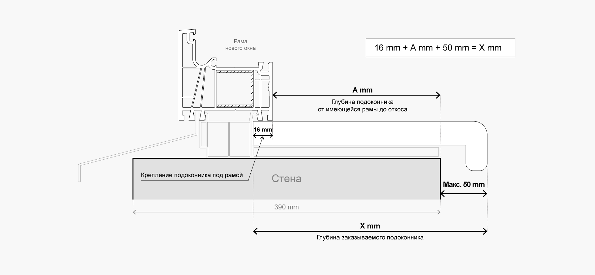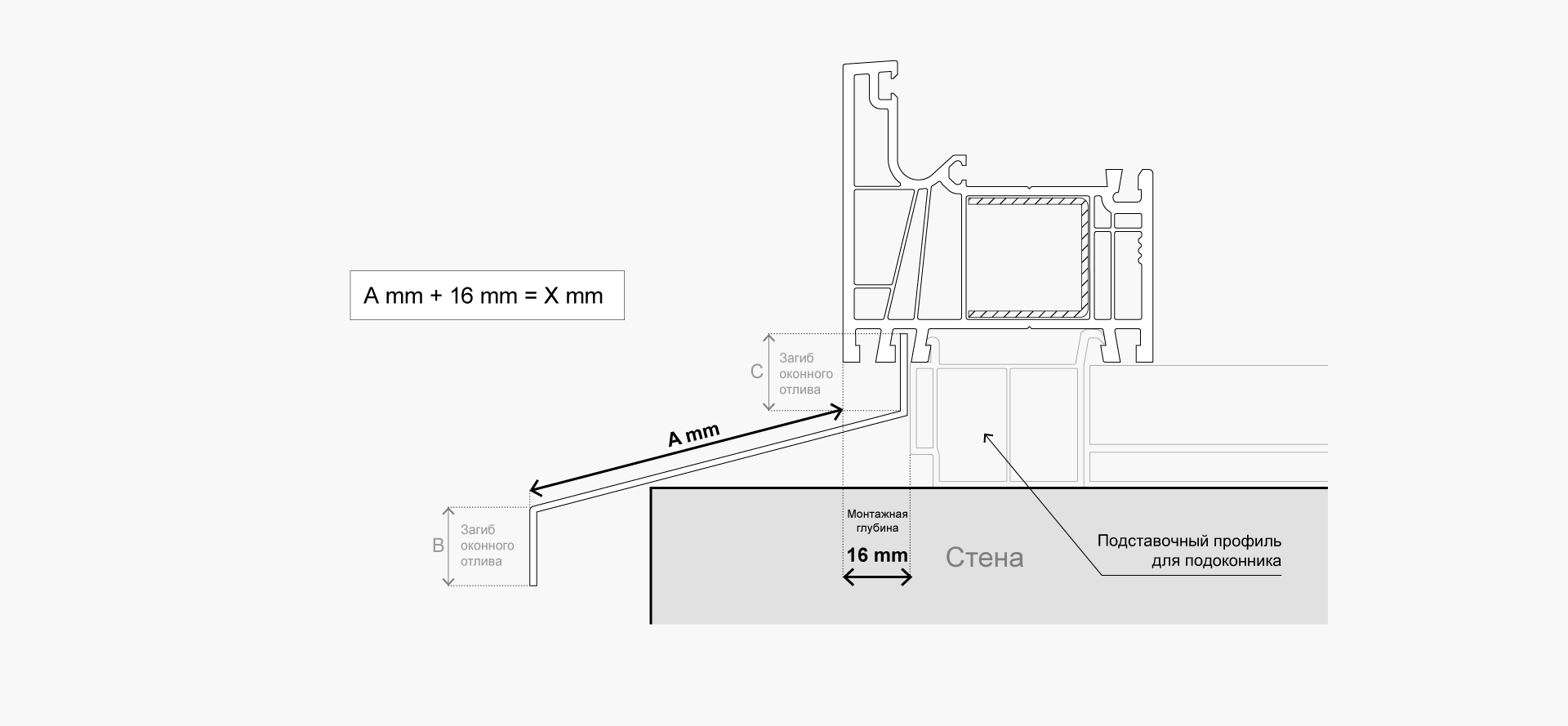 Сложите следующие параметры (см. рисунок ниже): А мм (требуемая ширина оконного отлива) + 16 мм (для крепления оконного отлива под рамой) = X мм (глубина оконного отлива для заказа).