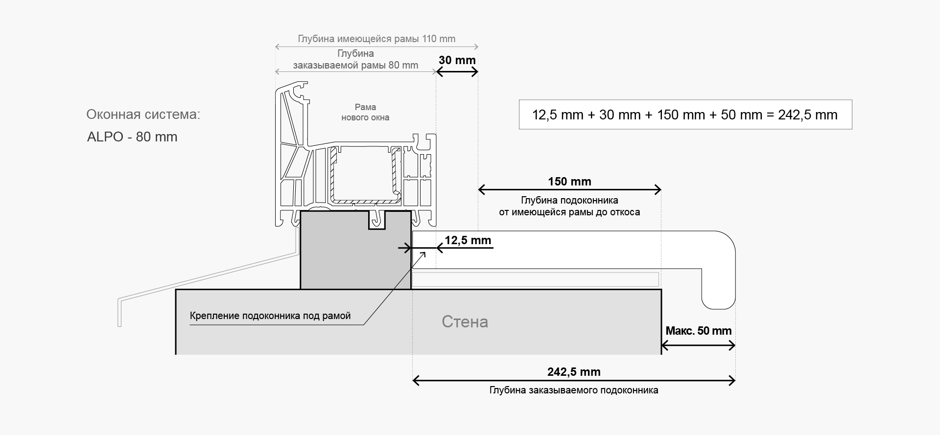 - 12,5 мм – расстояние для крепления подоконника под рамой системы ALPO;