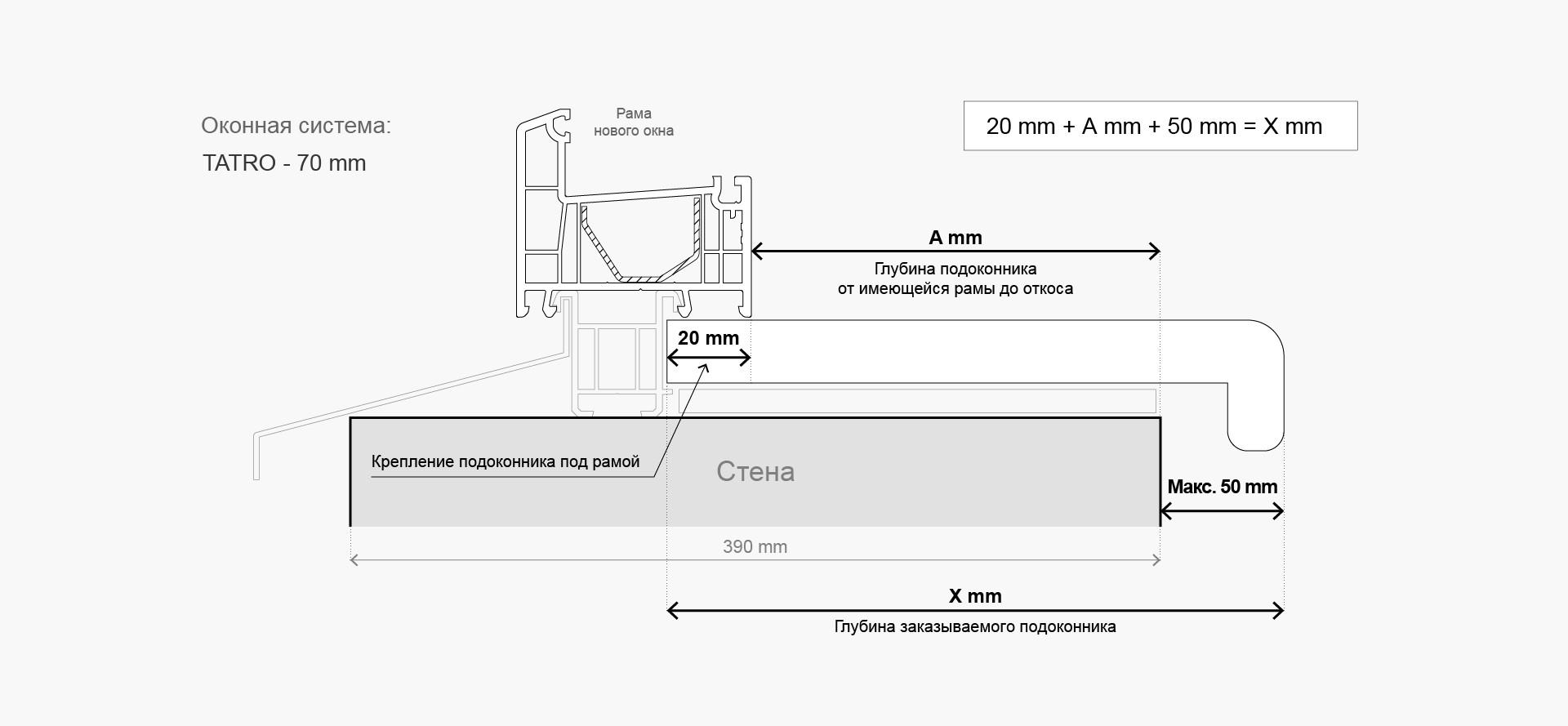 Сложите следующие параметры (см. рисунок ниже): 20 мм (для крепления подоконника под рамой) + A мм (расстояние от рамы до откоса) + максимум 50 мм (для выступа подоконника за края откоса) = X мм (глубина подоконника для заказа):