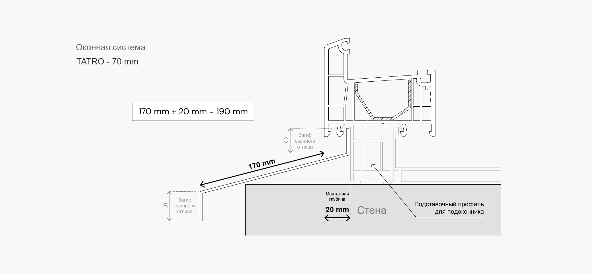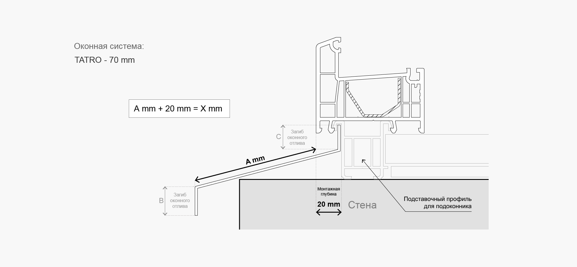 - 20 мм - расстояние для крепления подоконника под рамой системы TATRO;