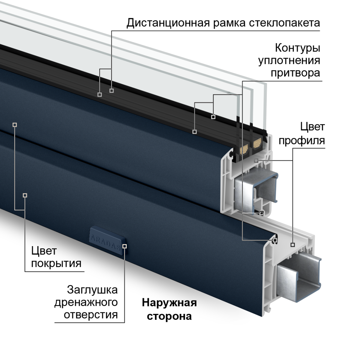 - Заглушки дренажных отверстий с наружной стороны, в нижней раме - белого цвета RAL 9016.