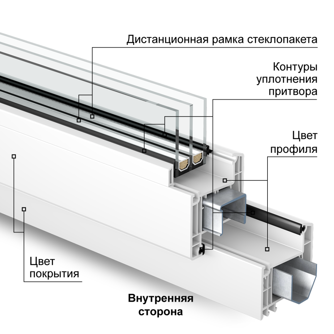 Декоративные цветные покрытия. Выбранные цветные покрытия наносятся при помощи пресса в заводских условиях только на внешние видимые поверхности профилей (внутренняя (интерьерная), и наружная стороны изделия). Внутренние поверхности профилей, которые видны при открывании створки изделия, всегда будут иметь цвет основы профиля и технологически не покрываются декоративными покрытиями.