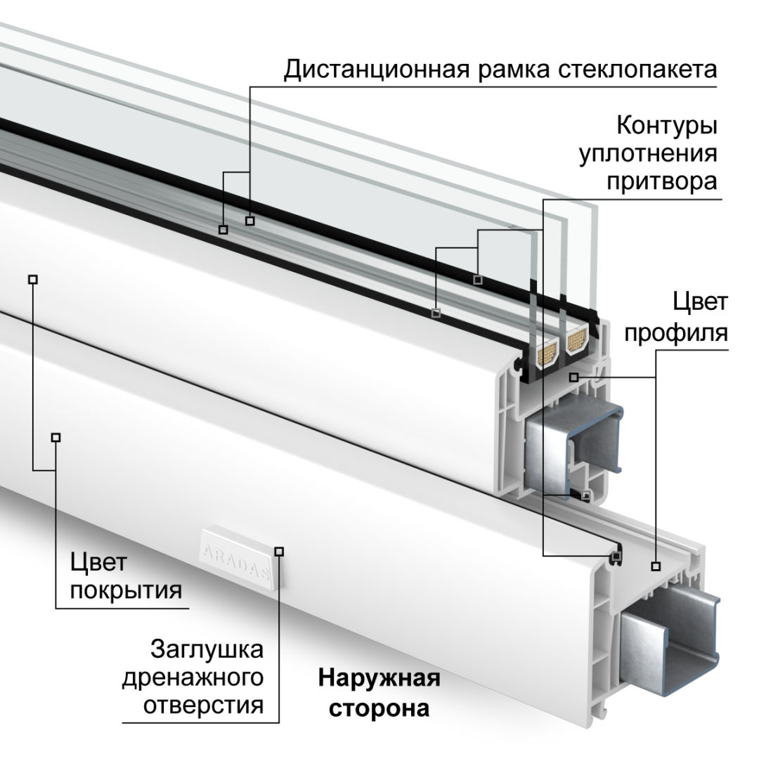 - Цвет основания профиля различных профильных систем, который может меняться в связи с выбором декоративных цветов на внутренней (интерьерной) и наружной сторонах изделия;